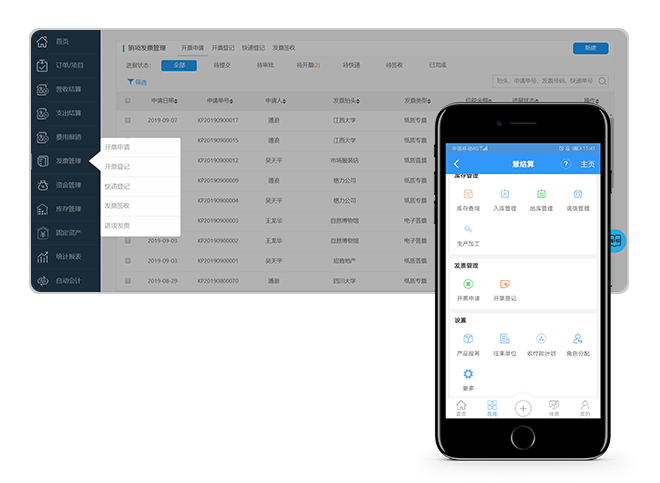 发票管理,翻账查阅更方便销项发票,进项发票,普票,专票,电子发票集中处理; 发票关联单据,查账有理有据